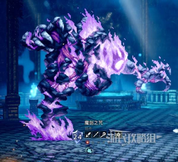 BOSS【魔剑之咒】弱点为【剑/枪/杖/冰/光】,HP405000,盾25,掉落【暗之精灵石(巨大)】。