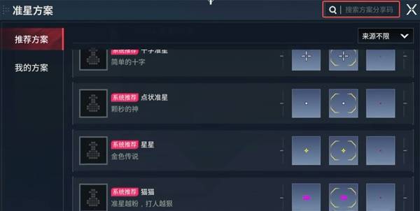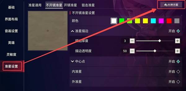 进入进设置页面后,点击左边菜单栏里的“准星设置”,点击大神方案,点击搜索并输入准星码,这样就可以导入准星码了。