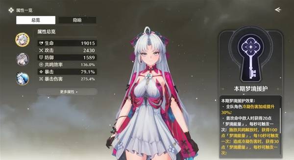通过普攻和技能获得梦境能量。当梦境能量充满到500点后,明晰梦状态被激活,持续10秒。角色在此期间获得100%共鸣效率加成、50%暴击加成和技能CD减少50%
